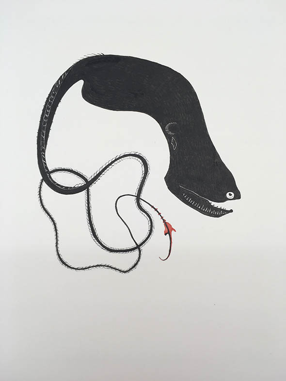 Die Installation Dunkle Tiefen von Luise Kloos führt in noch nahezu unerforschten Tiefen von 4.000 Meter und mehr unter dem Meeresspiegel, in denen Licht keine Rolle mehr spielt. Die kolorierten Tuschezeichnungen und der Animationsfilm zu Dunkle Tiefen zeugen von Kloos‘ Faszination mit naturwissenschaftlich-historischen Abbildungen von Tiefseefischen, die in ihrer pittoresken Gestalt unsere Phantasie beflügeln. Die künstlerische Kreativität vermag der ungeheuren Formen- und Farbenvielfalt der Tiefseelebewesen kaum etwas entgegenzusetzen. Dennoch sind Kloos‘ Zeichnungen nicht Nachahmungen der auf atemberaubende Weise (über „Live“-Schilderungen aus der Tiefe) von Forscherinnen und Forschern um Charles William Beebe in den 1930er-Jahren erzeugten Vorbilder sondern, um mit Roland Barth zu sprechen, Simulacra: Es entsteht eine „Welt, die der ersten ähnelt, sie aber nicht kopiert, sondern einsehbar machen will“.
