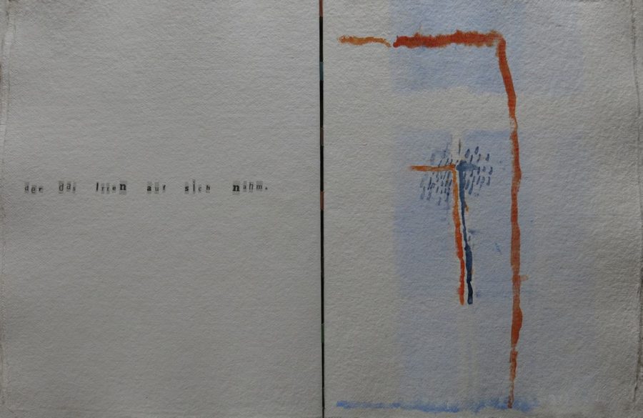 Der Arbeitsprozess gestaltete sich in vielen Vorentwürfen, war doch der Respekt in ein bereits gebundenes Buch hineinzuarbeiten sehr groß. Zuerst die Zeileneinteilung – ich ziehe 3 Zeilen im Gedicht für das Buch zusammen, danach geschieht die Auswahl und das Kleben der Buchstaben. Die bildnerische Gestaltung beginne ich mit der Zeile „in der Wildnis über den Wassern“ auf Seite 5 und arbeite mich dann zurück zur Seite 1, danach Seite für Seite bis zum Ende des Buches.